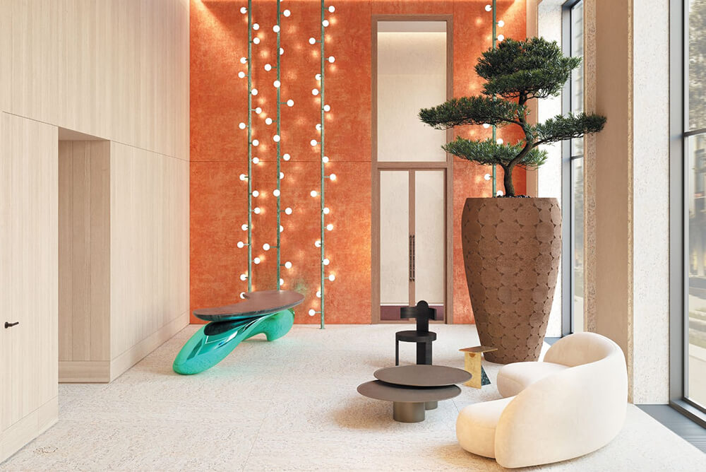 Характер и индивидуальность интерьеров подчеркиваются объемной керамической плиткой, медными оттенками и цветной сталью. Каждый предмет в вестибюле - это произведение искусства. Например, для живого растения дизайнеры подобрали керамику, сделанную вручную, а дерево дуба и ореха раскрывают свою красоту благодаря мастерству столяров.