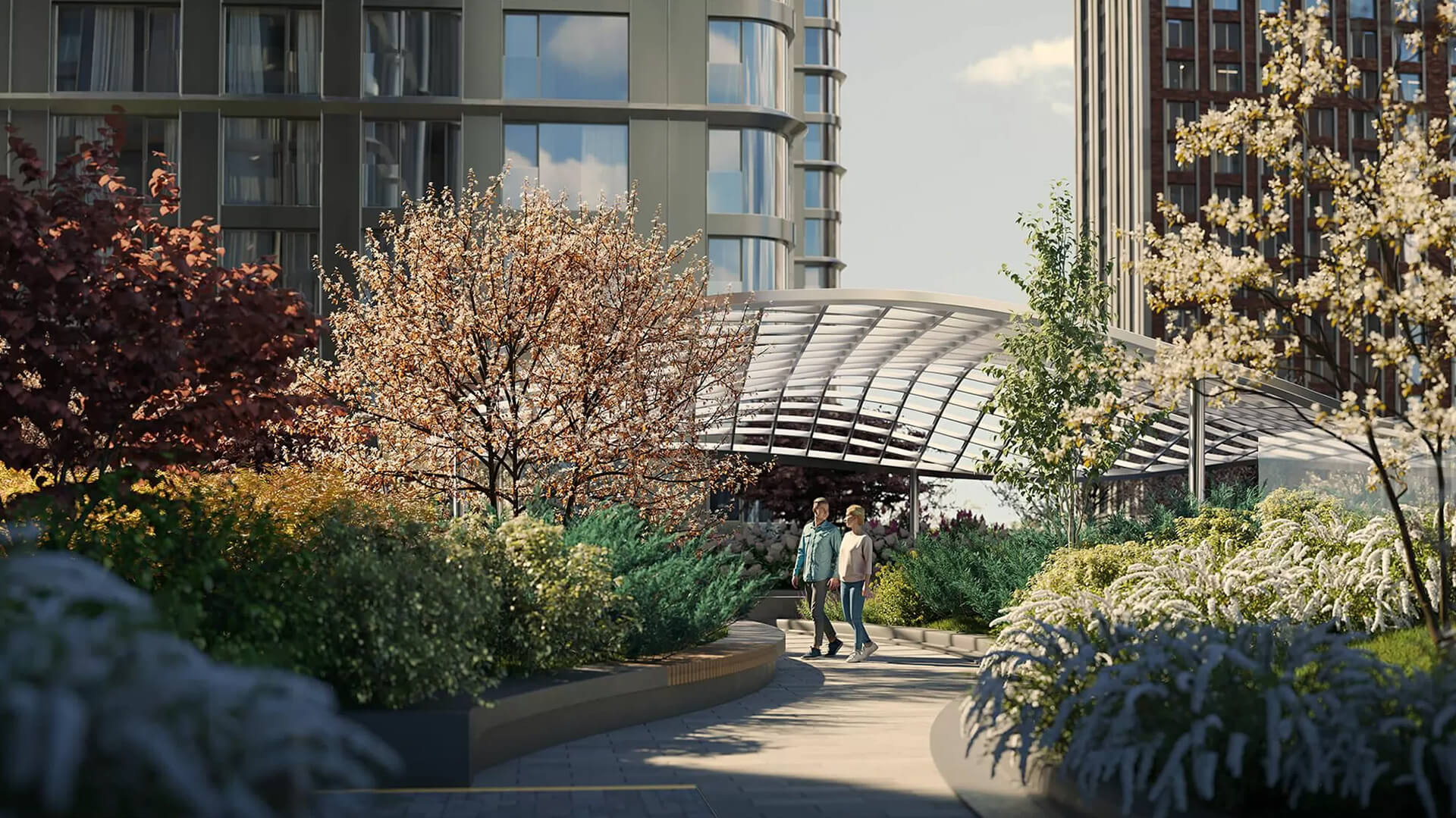 Большие дворы жилого комплекса City Bay, плавно перетекая друг в друга, создают единое пространство. Ландшафтные решения объединяют разные по форме и движению зоны — внутренние дворы, бульвар и набережную — в целостный зеленый ансамбль.
