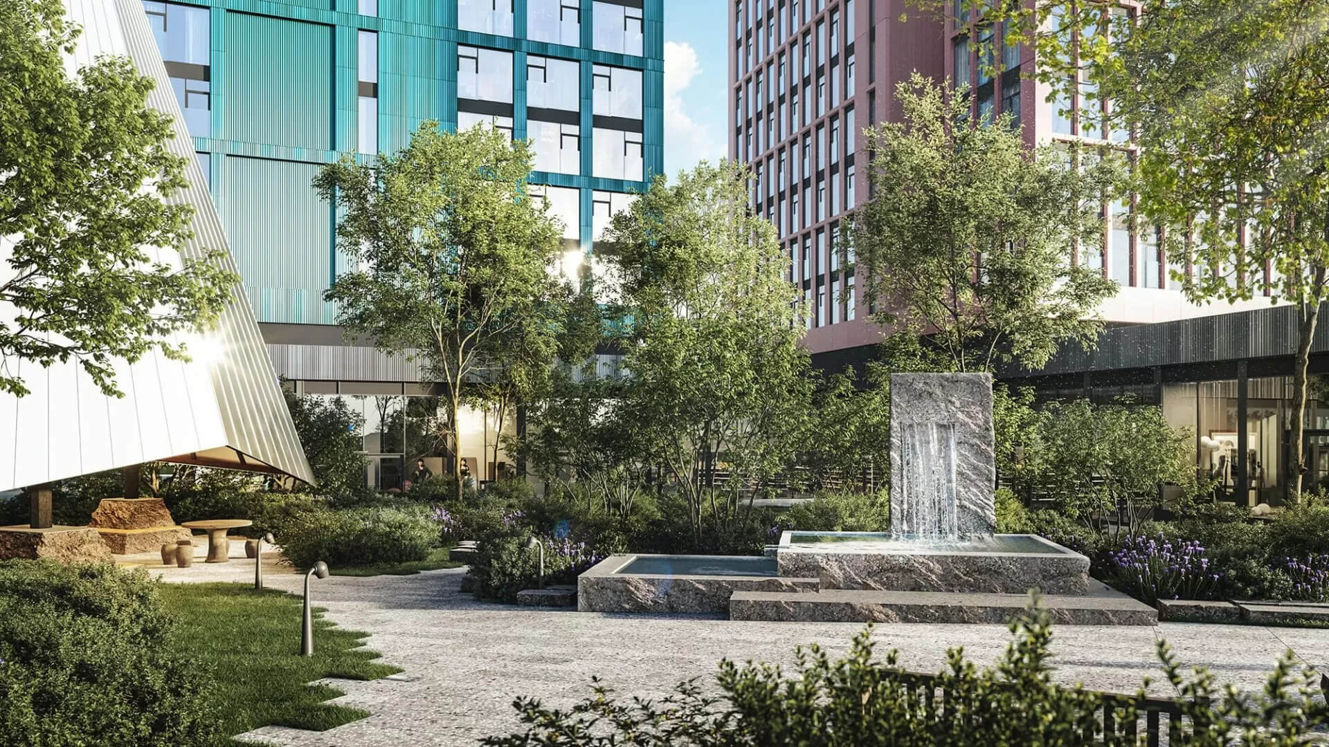 Архитектура комплекса представляет собой сочетание городской и природной среды, небоскребов и малоэтажных зданий зданий, активной жизни и спокойных пейзажей. Высота кварталов постепенно увеличивается от реки к городу, а материалы строений варьируются от плотных кирпича и камня до легких стекла и металла. Общая структура комплекса включает общественные, полуприватные и приватные пространства.