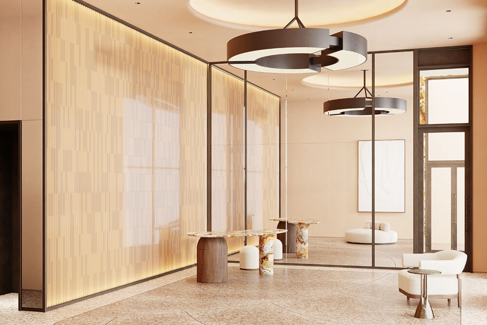 Лобби, которые резиденты жилого комплекса City Bay посещают ежедневно, а иногда и несколько раз в день, всегда вызывают восхищение. Высокие потолки, панорамные окна и необычные системы освещения создают красивые пропорции и интересные световые эффекты в вестибюле.