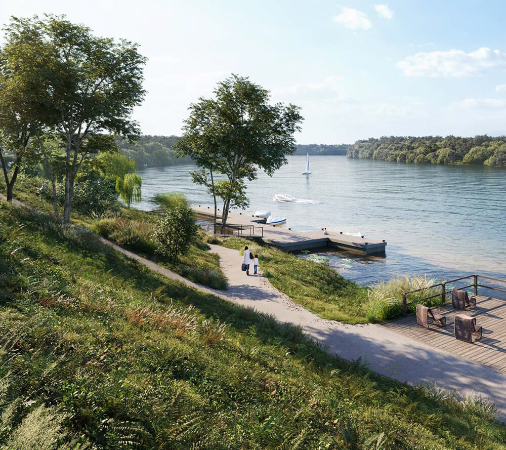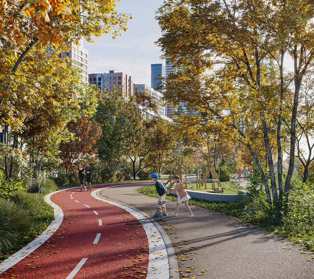 Планируется создать парк вдоль Москвы-реки с велосипедными и беговыми дорожками. Парк будет соединять все кварталы с рекой и сделает район Покровское-Стрешнево еще более привлекательным. Пешеходная дорожка, лесная тропа с маленькими балконами для просмотра и деревянными скамейками, велосипедные дорожки с хорошим покрытием, места для отдыха под деревьями - все это будет украшать берег Москвы-реки. Основной акцент - понтонный причал, вход на который будет прямо с главной площади жилого комплекса.
