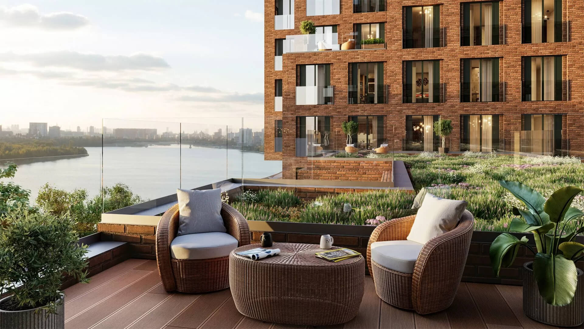 Фасады зданий облицованы природными материалами, такими как клинкерная плитка и фактурный кирпич. Контраст текстур создает гармоничный и стильный облик. Большие окна позволяют наслаждаться прекрасными видами и заполняют комнаты естественным светом.